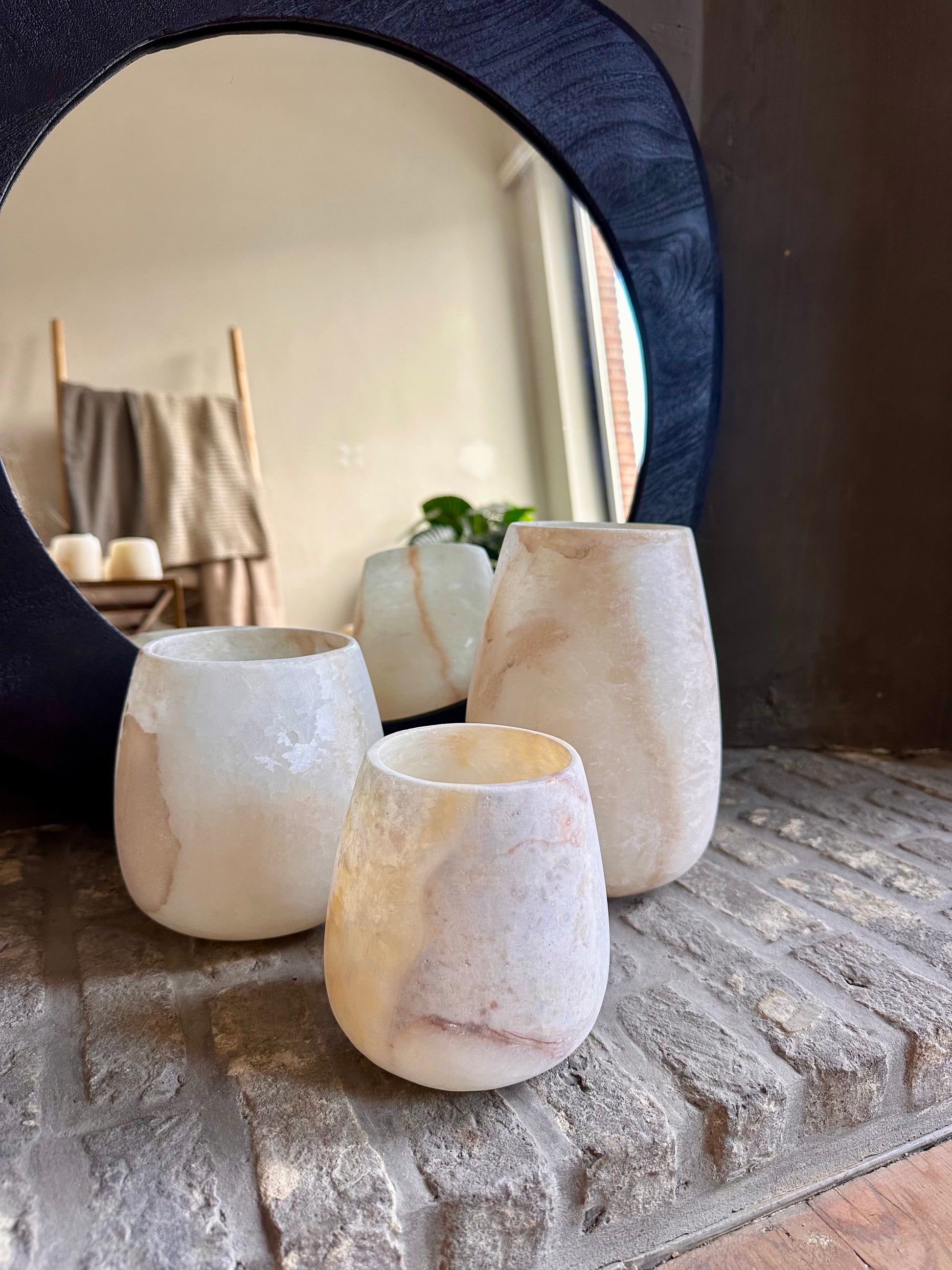 Onze glazen Teardrops waren al razend populair, maar nu is dit iconische design er ook in een nieuwe uitvoering: alabaster. Dit natuurlijke gesteente laat het kaarslicht zacht doorschijnen en geeft meteen een warme, serene sfeer. Elke houder is uniek in kleur en structuur – pure, natuurlijke elegantie voor in huis.
