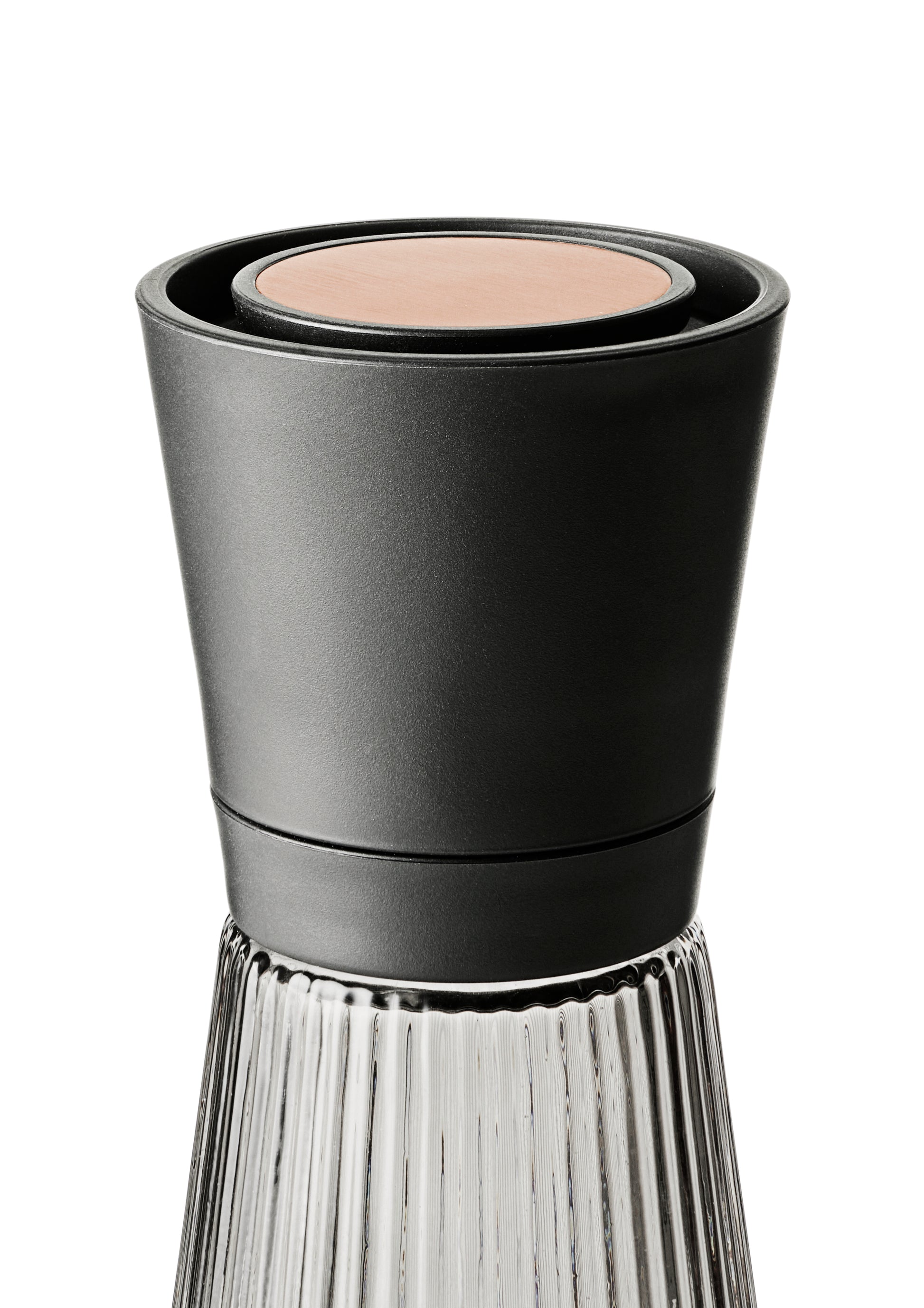 De Grand Cru Nouveau grinder is een eigentijdse herinterpretatie van de iconische Grand Cru klassieker. Het rookgrijze glas, gecombineerd met een zwarte kunststof top en gepatineerd staal, zorgt voor een moderne, krachtige uitstraling die perfect past in een stijlvol interieur.