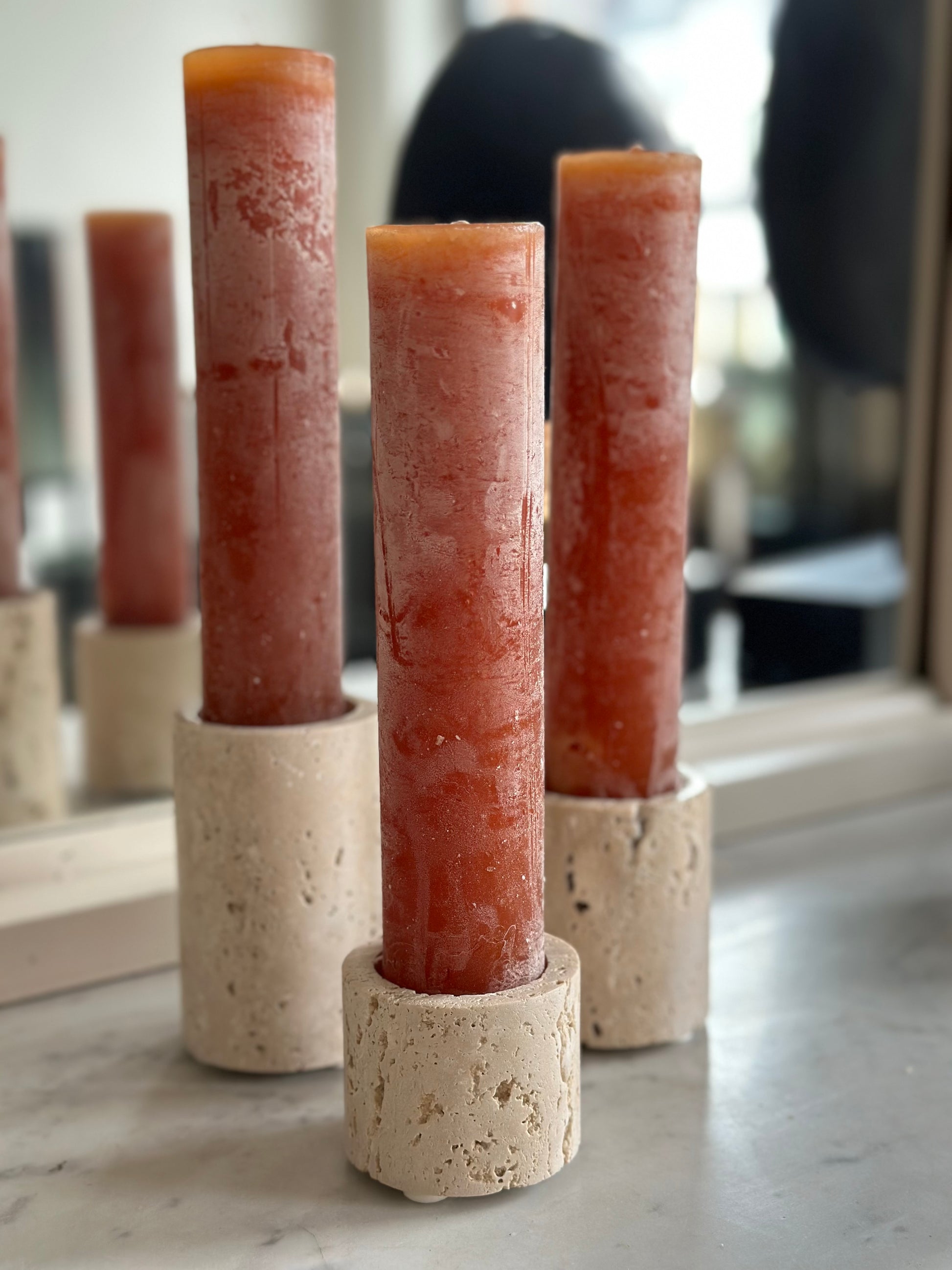 Breng natuurlijke elegantie in je interieur met deze prachtige set van drie kandelaren, vervaardigd uit authentiek travertin. De warme, aardse tinten en subtiele textuur van dit natuursteen maken de kandelaren tot een stijlvol accent in elke ruimte.